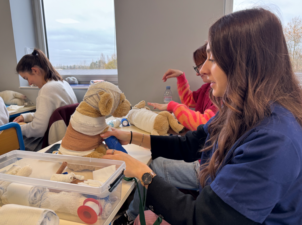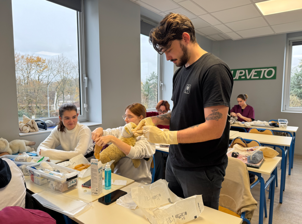Dans nos cours de Travaux Pratiques, les apprenants passent rapidement de la théorie à l’action. Bandages, soins, gestes techniques essentiels… chaque exercice est conçu pour développer les compétences et les bons réflexes du métier, dans des conditions proches de la réalité.